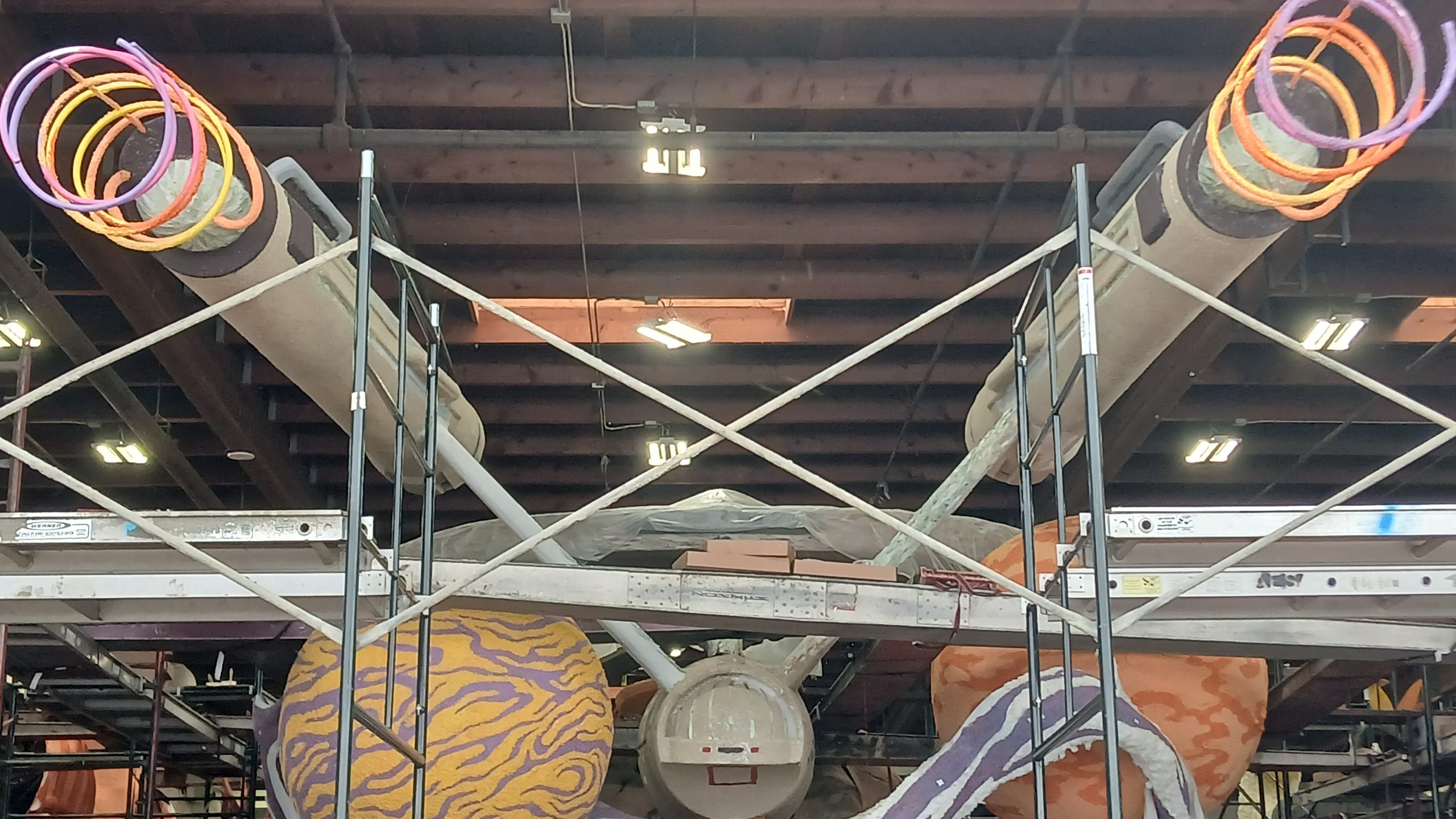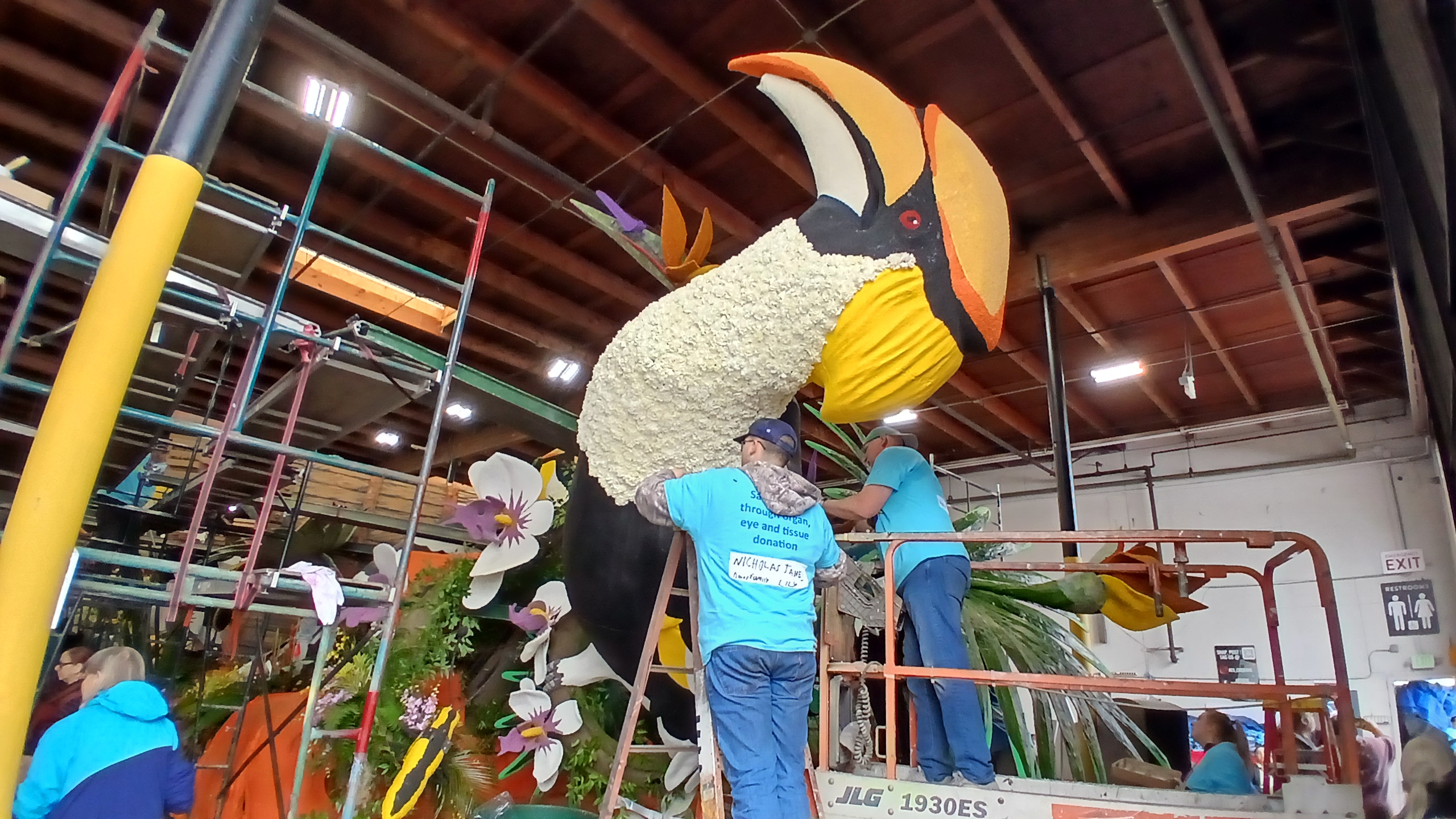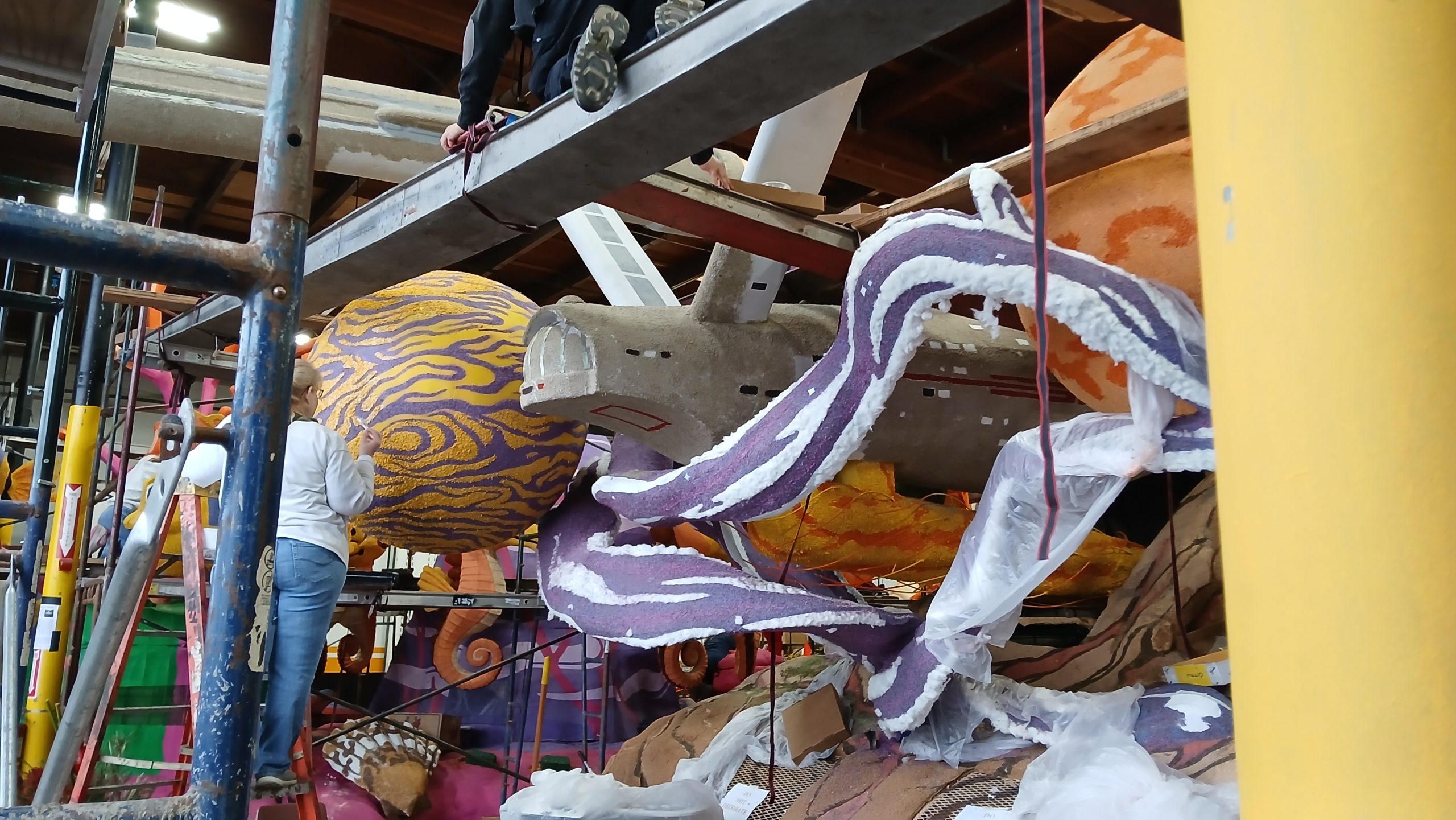 A half hour later, we were taken to the float.  All the floats are packed together in a warehouse with scaffolding everywhere to get to the higher parts of the floats.  I volunteered to b a climber and decorate the higher parts, but there were five of us who volunteered and they only needed two more climbers.