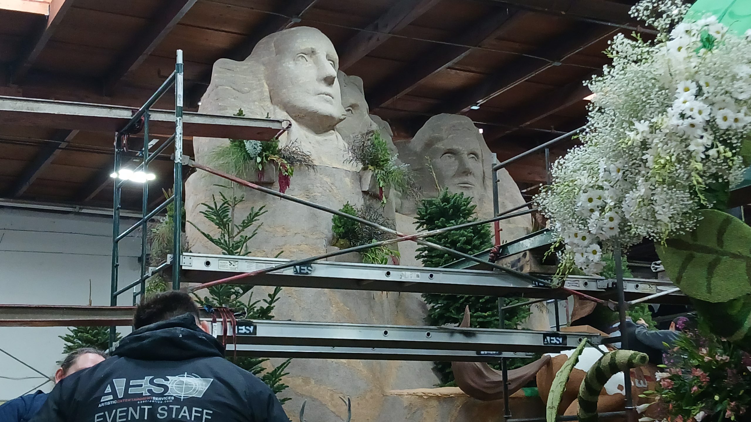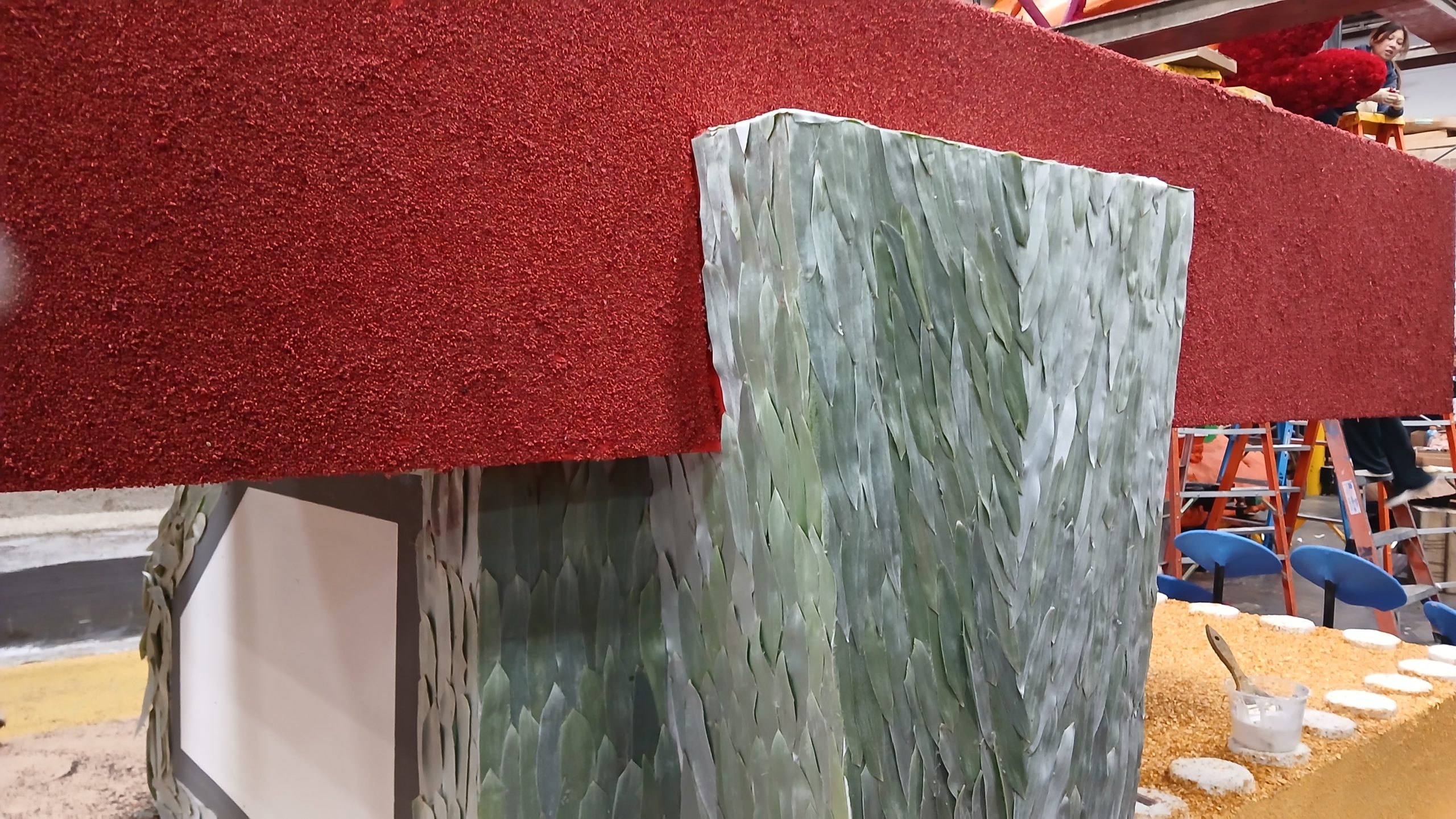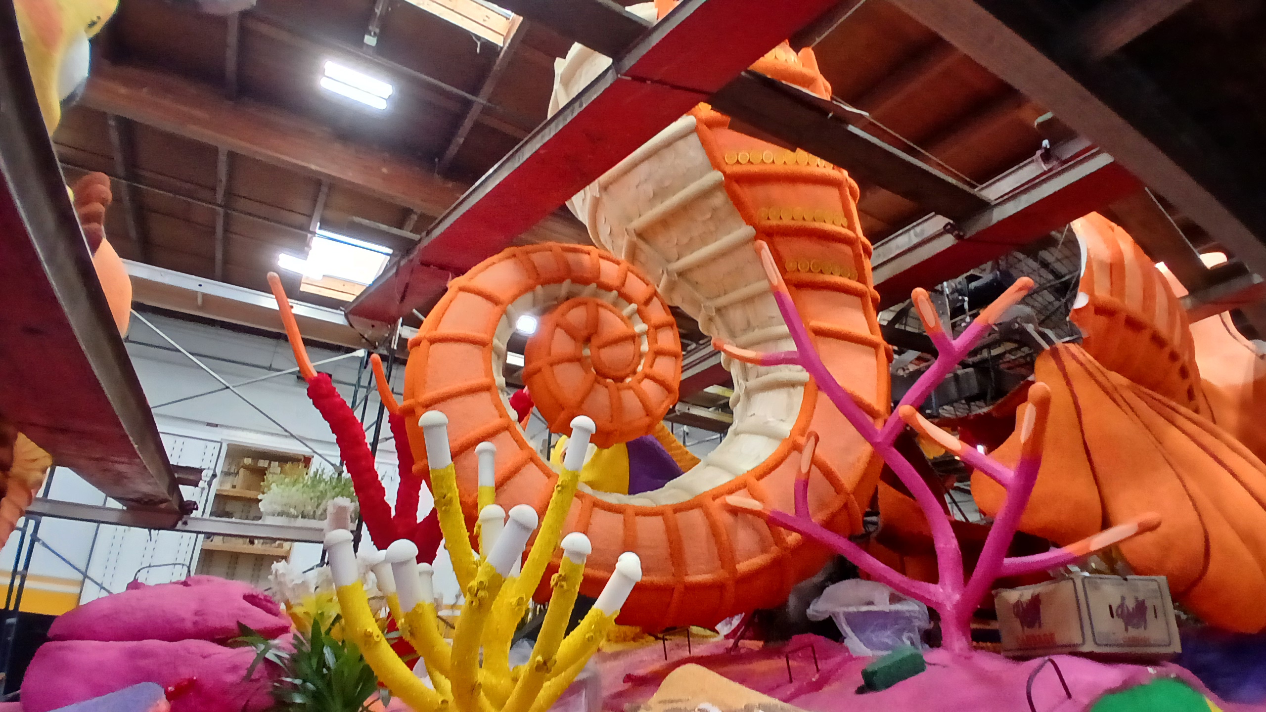 A half hour later, we were taken to the float.  All the floats are packed together in a warehouse with scaffolding everywhere to get to the higher parts of the floats.  I volunteered to b a climber and decorate the higher parts, but there were five of us who volunteered and they only needed two more climbers.